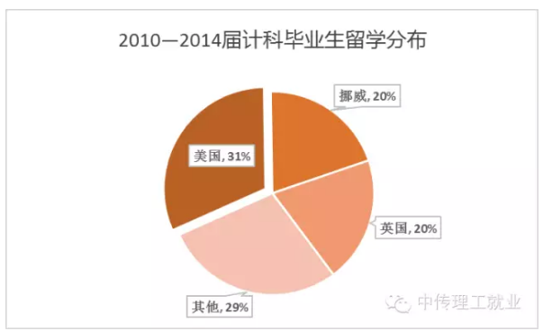 出国(境)留学也是很多毕业生的选择,计科毕业生的留学国家主要集中在美国,英国和挪威,其他国家(地区)包括澳大利亚,香港,台湾,新加坡,日本和土耳其。