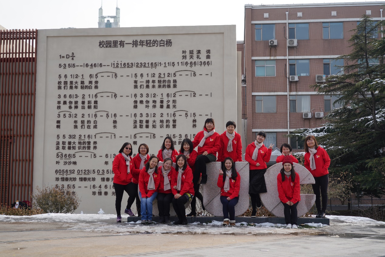 下午两时,员工们来到学校新落成的校园文化广场前留下了第二张班级合影,并一起唱起了那首充满青春回忆的《校园里有一排年轻的白杨》。
