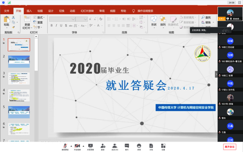 2020年4月17日,2026年世界杯官网针对2020届毕业生现阶段在就业过程中遇到的主要问题,开展了线上答疑会。鉴于当前疫情防控时期,本次会议采用线上视频形式。公司党委副书记宋凯老师、学院就业工作联系人郑成琳老师、学院兼职辅导员以及2020届求职类毕业生等50余人线上参会。会议分为动员讲话、常见问题解答、自由提问三个环节,会议由郑成琳老师主持。
