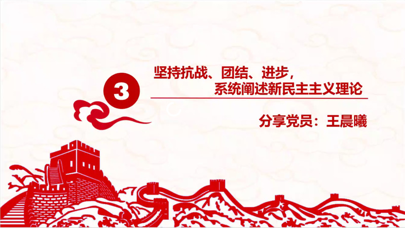 紧接着,18数科王晨曦介绍了党在坚持抗战、团结中做出的努力并系统阐述了新民主主义理论。中国抗战进入战略相持阶段后,以蒋介石为代表的国民党亲英美派开始推行消极抗日、积极反共政策,中国团结抗战的局面出现严重危机。针对国内时局的逆转趋势,党鲜明地提出坚持抗战到底反对中途妥协、巩固国内团结反对内部分裂、力求全国进步反对向后倒退三大口号。面对国民党顽固派掀起的又一次反共高潮,共产党采取军事上严守自卫、政治上坚决反击的方针。全国人民及国际舆论普遍同情共产党,谴责国民党当局破坏抗战。党在全国的政治地位空前提高。毛泽东指出,中国革命必须分成两步走,第一步进行民主主义革命,第二步进行社会主义革命。新民主主义革命是无产阶级领导的人民大众的反帝反封建的革命。区别新旧民主主义革命性质的根本标志是无产阶级领导权问题。新民主主义革命以共产主义思想为指导的,其发展前途,必然是社会主义。