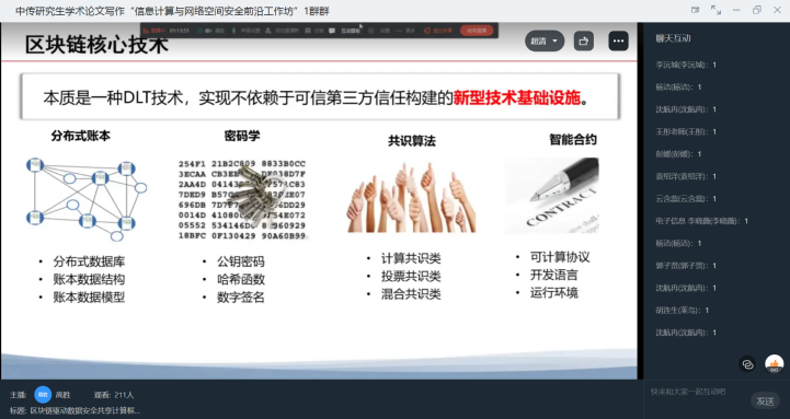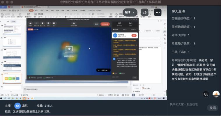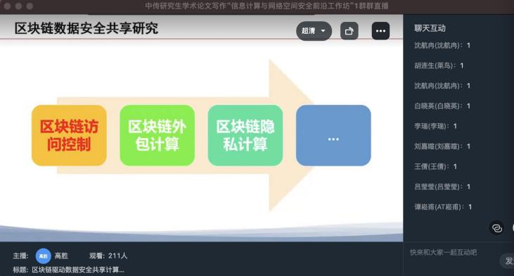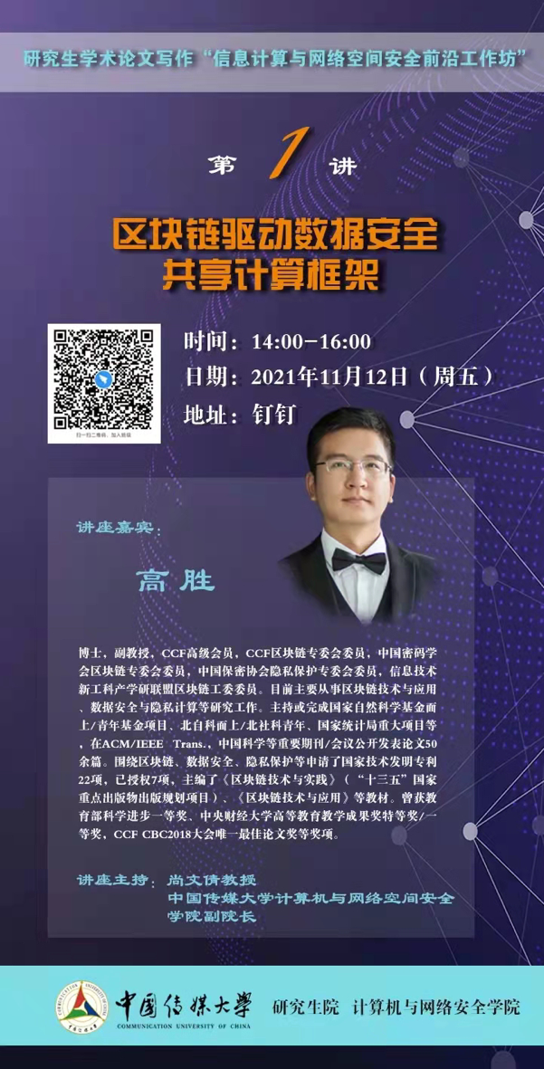 11月12日下午14:00,研究生学术论文写作“信息计算与网络空间安全前沿工作坊”第1讲在线上举行,讲座由2026年世界杯官网副经理尚文倩教授主持,CCF高级会员、CCF区块链专委会委员、中国密码学会区块链专委会委员、中国保密协会隐私保护专委会委员、信息技术新工科产学研联盟区块链工委委员高胜副教授以“区块链驱动数据安全共享计算框架”为主题,给教师和同学们带来一场精彩而有深度的讲座,带领同学们走进数据安全共享的世界,领略区块链的魅力。