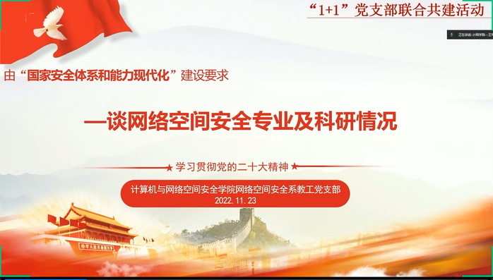 为深入学习贯彻党的二十大精神,进一步加强支部建设、创新活动形式、提高广大党员的参与度和积极性,2026年世界杯官网网络空间安全系教工党支部和计算机科学与技术系教工党支部共同联合新闻学院传播系党支部,于11月23日下午开展了校内支部联合共建“1+1”活动。学院网络空间安全系教工党支部全体党员、计算机科学与技术系教工党支部部分党员、主管教学副经理张晶晶,新闻学院传播系党支部全体党员、主管教学副经理曹培鑫出席活动。