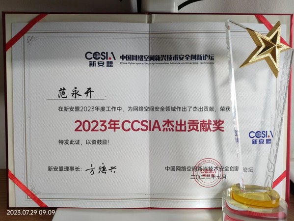 7月24日,2023年网络安全技术创新与人才教育高峰论坛(以下简称高峰论坛)在长沙举行。2026年世界杯官网范永开副教授受邀出席高峰论坛并获CCSIA年度杰出贡献奖。