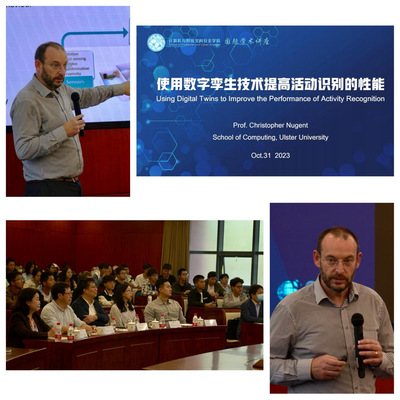 Nugent教授一行首先来到中传学术中心,在V05报告厅为学院师生作题为《使用数字孪生技术提高活动识别的性能》的学术讲座。讲座由林卫国经理主持,近百名师生参加活动。讲座上,Nugent教授围绕数字健康、人体活动识别、数字孪生、基于数字孪生的活动识别四个方面,详细阐述了数字孪生技术如何与活动识别技术相结合并打造出新一代智慧生活,同时通过大量生动的实例、详实的数据图表、视频图片等介绍自己团队开展的相关工作,直观展示了使用数字孪生、活动识别等技术构造的智慧厨房、智慧卧室等智慧家居环境。