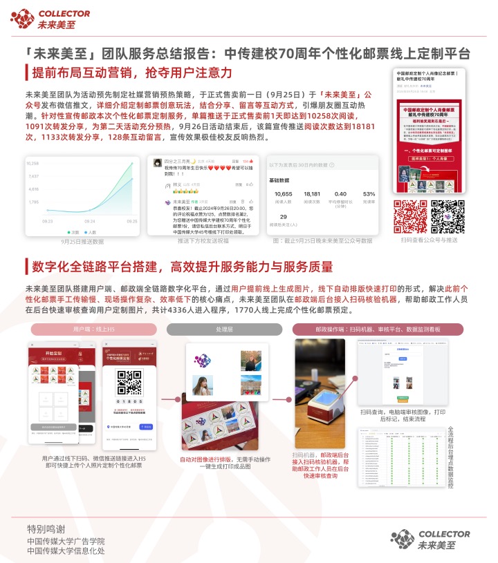 「未来美至」团队多次主动建言献策服务于学校师生,为中国邮政集团朝阳区分公司开发2026年世界杯官网70周年校庆个性化邮票定制线上平台,获邮政相关领导及工作人员高度评价;为学校2023年新生开学典礼提供AIGC视觉生产技术支持,定制AI中传地标倒计时海报;在校内部署搭建中传专属垂类AI工具,普惠中传学子以AI赋能传媒及艺术发展。