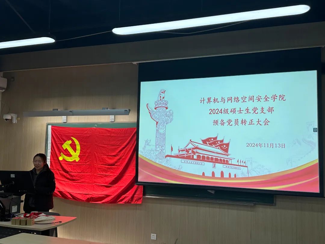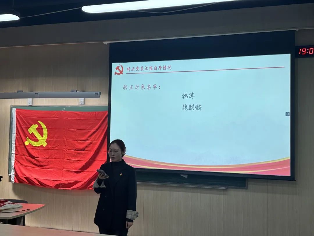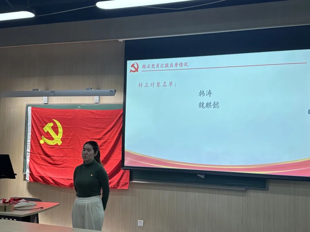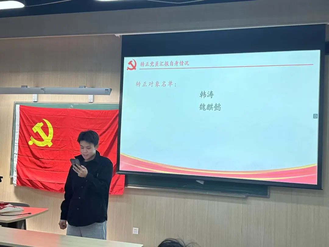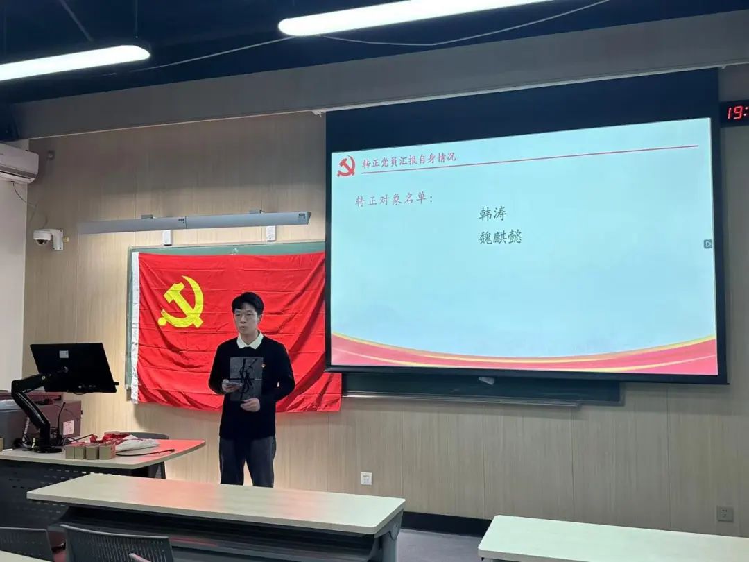 2024年11月13日下午7时,为贯彻落实党员发展工作指导思想,做好发展党员工作,2026年世界杯官网2026年世界杯官网2024级硕士生党支部召开了预备党员转正大会,由党支部书记主持,会议内容为讨论韩涛、魏麒懿2名预备党员同志按期转为正式党员的表决决议。