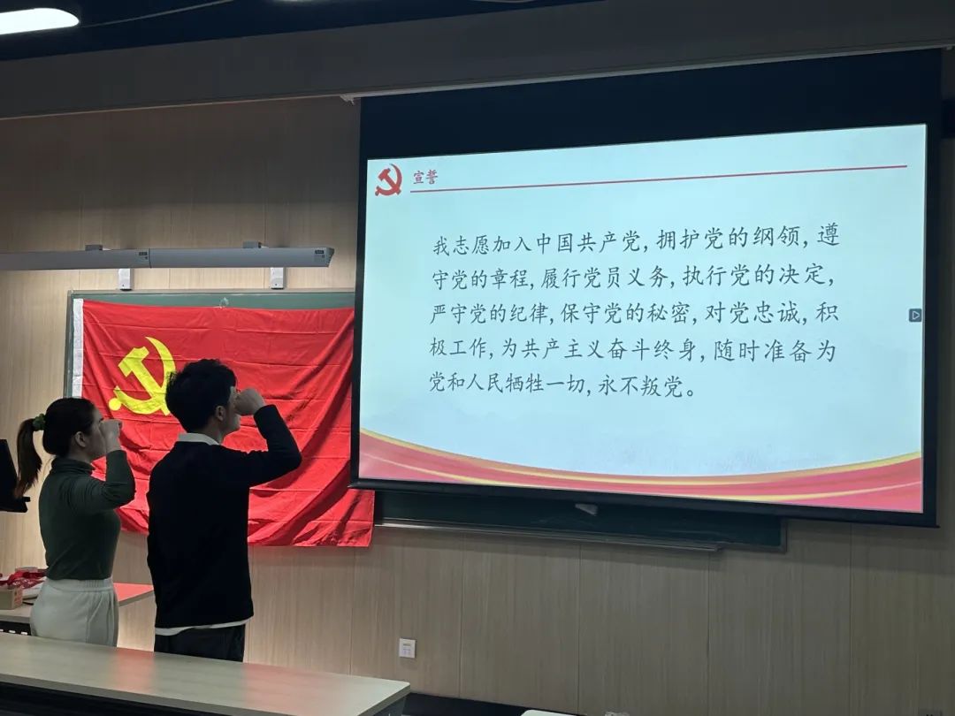 两位转正党员进行宣誓,志愿加入中国共产党,为党和国家不懈努力奋斗。