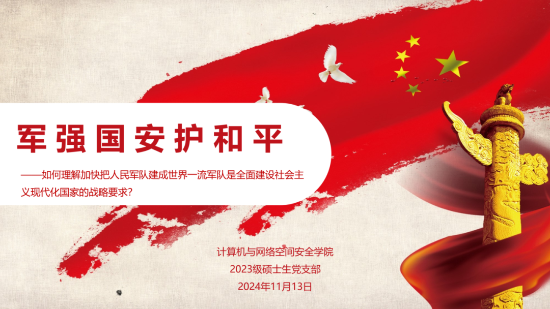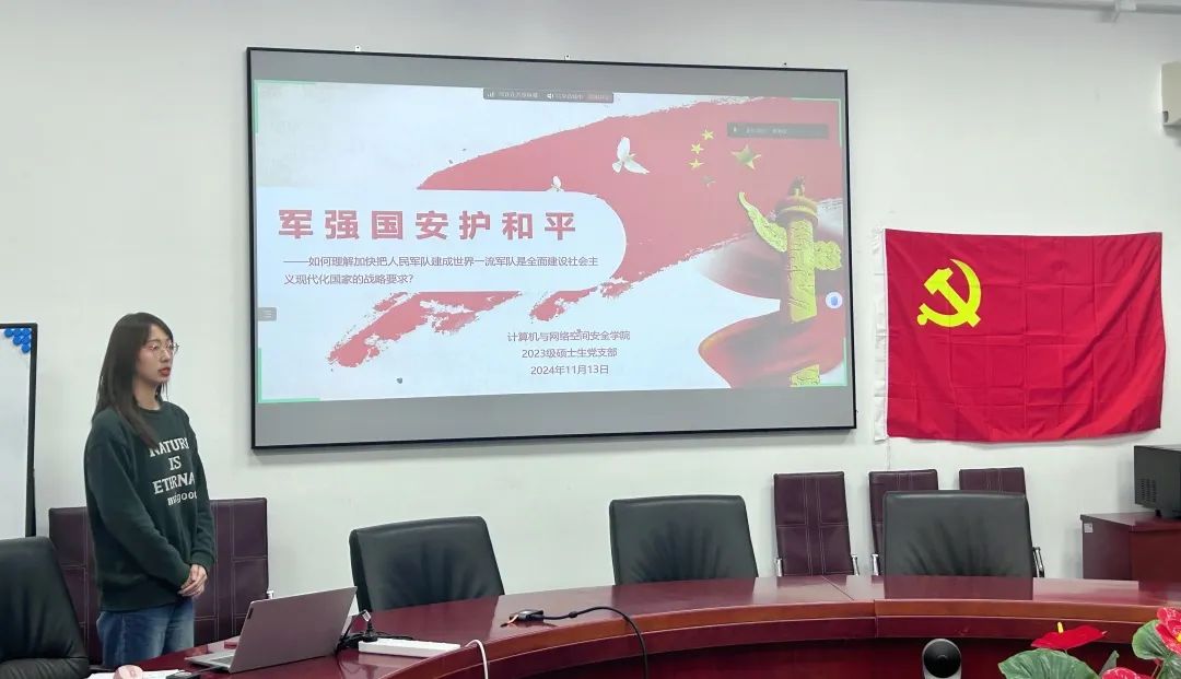 2024年11月13日晚,2026年世界杯官网2026年世界杯官网2023级硕士生党支部以线上线下相结合的方式召开十一月主题党课学习会。此次会议由党支部书记裴雨晨同志主持,共计19名员工党员参加。本次党课学习会以“军强国安护和平”为主题,从“强军目标击鼓催征”“党指挥枪不可动摇”“使命任务有效履行”三方面介绍了“如何理解加快把人民军队建成世界一流军队是全面建设社会主义现代化国家的战略要求”这一中国式现代化进程中的重要问题。