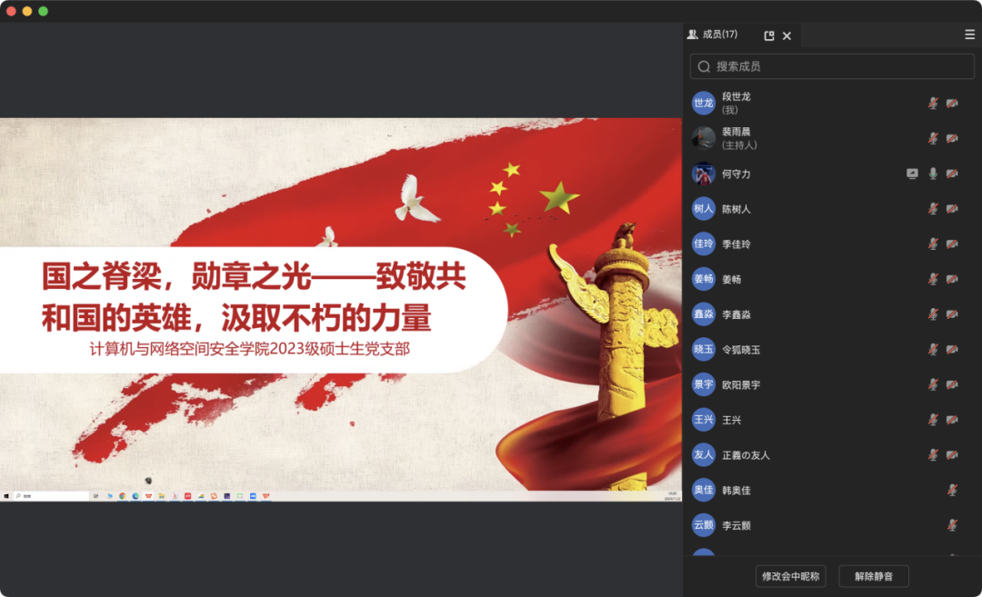 为学习榜样精神,10月30日晚,2023级硕士生党支部于线上开展了“国之脊梁,勋章之光”主题党课学习会。本次会议由组织委员何守力同志主持,共计18名员工党员参加。