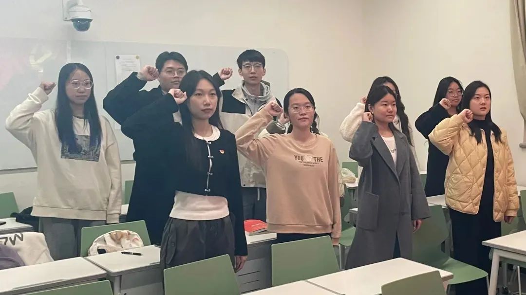正式党员董芳瑜作为领誓人,带领学院9名新加入的预备党员面对党旗庄严宣誓。