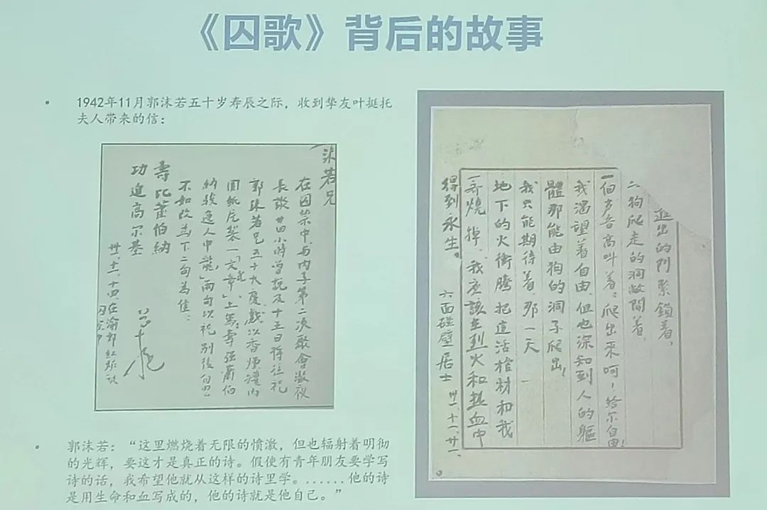 叶莲老师讲述到,1941年,震惊中外的皖南事件爆发,叶挺带领新四军浴血奋战了七昼夜,打得非常惨烈,最终,因寡不敌众,弹尽粮绝,新四军9000余名抗日将士,除约2000人拼死突围,一部分人被俘,其余均壮烈牺牲或失散。在生死存亡之际,叶挺代表新四军下山跟蒋介石谈判,遭到扣押,关进囚牢。叶莲老师说,在被关押的五年里,国民党不断变化关押地点,达到7次之多。接二连三的劝说和颠沛流离的生活,并没有削弱叶挺的意志。反而在牢狱之中书写了名垂千古的诗篇《囚歌》。