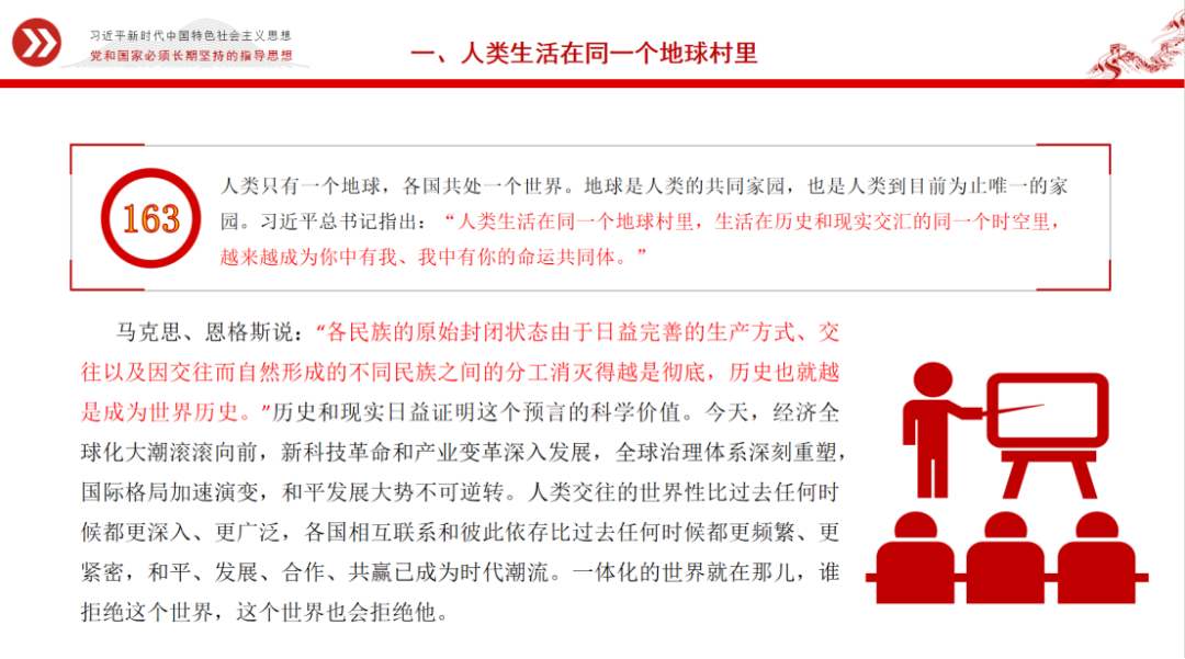 首先,我们学习了习近平新时代中国特色社会主义思想中关于新时代中国特色大国外交的重要论述。中国特色大国外交坚持自信自立、开放包容、公道正义、合作共赢,坚定致力于推动构建人类命运共同体,充分彰显中国负责任大国担当。