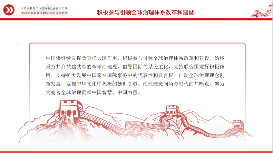 习主席深刻指出:“我们参与全球治理的根本目的,就是服从服务于实现‘两个一百年’奋斗目标、实现中华民族伟大复兴的中国梦。”从参与全球治理、推动全球治理体制向着更加公正合理方向发展,到参与引领全球治理体系改革和建设,中国推动建设更加美好世界的理念更加鲜明,意志更加坚定,步伐更加坚实。