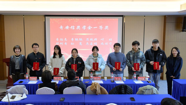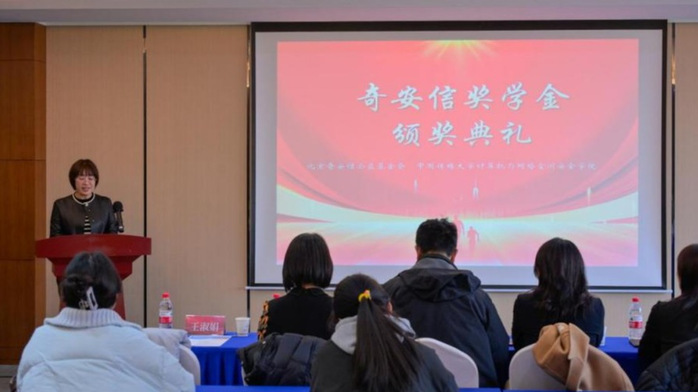 奇安信公益基金会杨文华副秘书长、公司党委书记王淑娟为获得一等奖学金的同学颁奖
