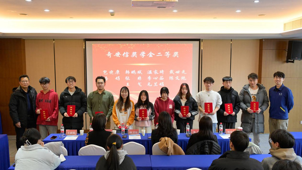 奇安信公益基金会项目主管刘昊鑫、学院经理林卫国为获得二等奖学金的同学颁奖