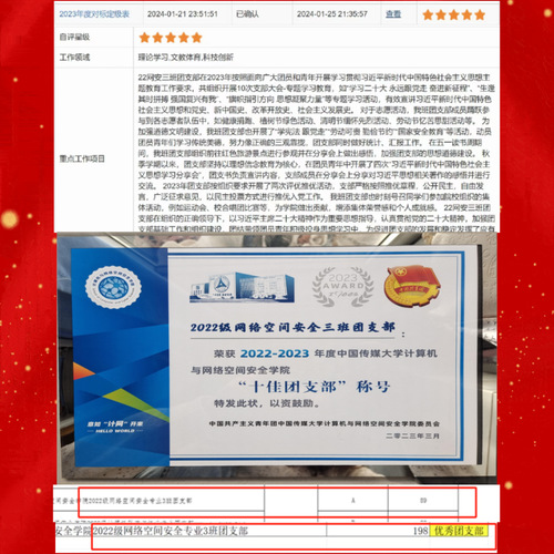 2022级网络空间安全3班团支部现有团员22人,今年又添新力量,1名新发展团员顺利加入我们的队伍。在党建工作中,本科生党支书带领2名预备党员和9名入党积极分子不断前进。团支部成员表现突出,两名同学荣获校级优秀团员称号。依据“对标定级”参考标准,在2024年年度考核工作中,本团支部荣获五星团支部称号,并在团支部工作手册评定中斩获A等级,被评为“优秀团支部”。我们团结一心,积极进取,为党的事业贡献青春力量。