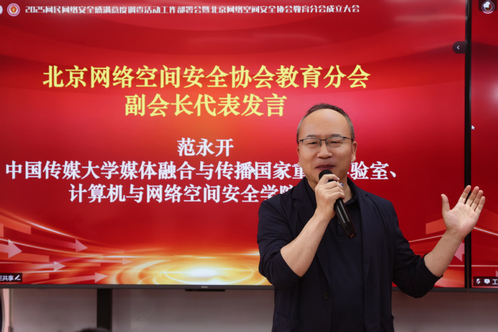 范永开教授作为副会长代表进行发言。他表示,未来将充分发挥学校在传媒与技术交叉领域的优势,推动人才培养与企业合作,开展数据安全、内容安全、传播安全、认知安全等方向的研究工作。同时,着力构建产学研企用一体化的社会责任体系,推动区块链安全、AI安全算法等前沿技术融入公司产品实践,助力破解网络安全人才实战能力不足的行业难题,为网络空间安全事业的高质量发展贡献智慧与力量。