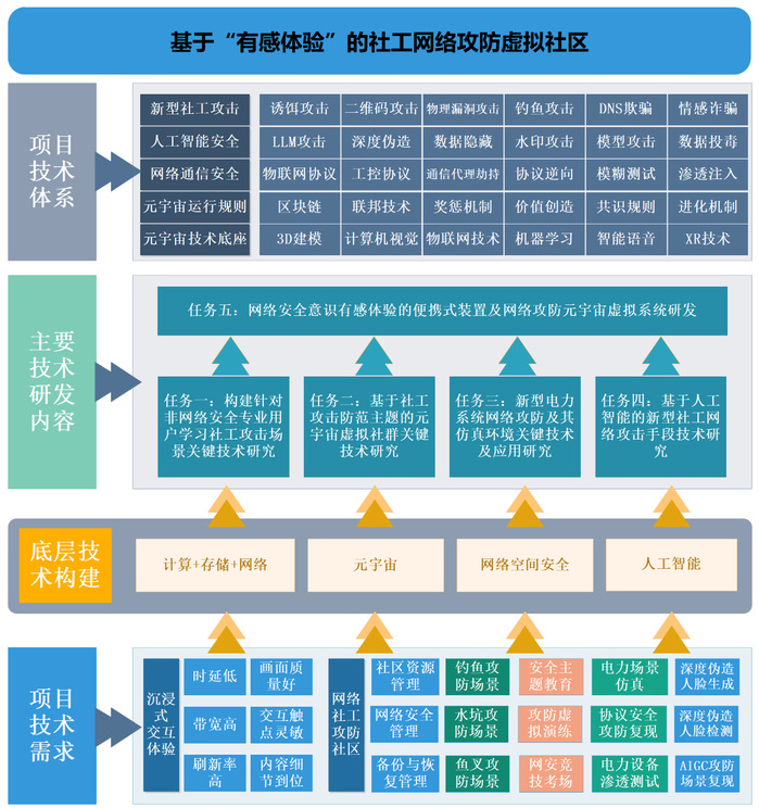 项目深度融合数字挛生与AIGC数字人技术,建成支持100并发访问、VR可视化呈现的“社工攻防”主题元宇宙社区,集成教育中心、演练大厅等多功能空间,为学员提供沉浸式攻防演练与交流平台。同时,针对新型电力系统业务特征,项目进一步研发容器化轻量仿真沙箱,支持多场景攻防脚本注入与可视化推演,打造出可复制的行业实战靶场。此外,项目还实现AI驱动的深度伪造“生成-检测-对抗”一体化训练模式,有效提升电力员工对AI合成类社工攻击的识别能力与应对水平。