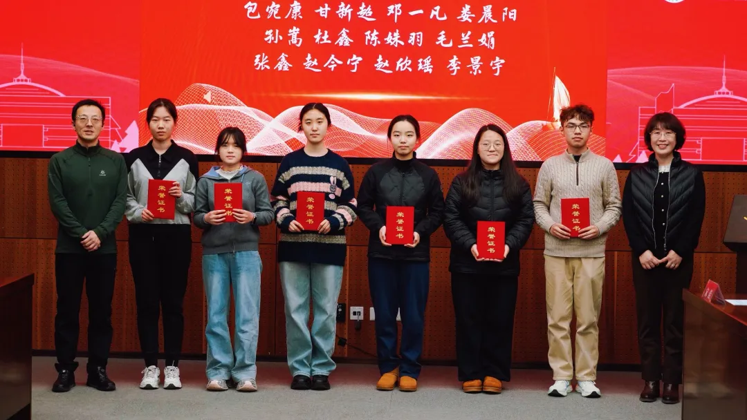 嘉宾们依次为获奖学子颁发荣誉证书并合影留念。