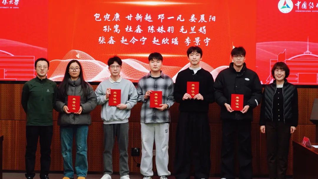 奇安信集团党委办公室主任、奇安信基金会副秘书长杨文华与传媒大学教育基金会副秘书长高明共同为一等奖获奖同学颁奖