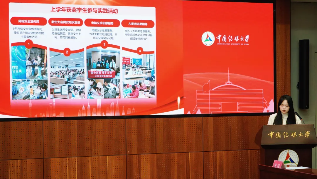 颁奖结束后,获奖员工代表先后登台分享感悟。本科生代表宋诗琳回顾了入学以来的专业探索与实践经历,感恩企业与学院的悉心培育,表示将以荣誉为起点,深耕网安专业领域,以专业所长响应国家战略,践行青年责任担当;研究生代表韩涛分享了自己在中传的求学蜕变与竞赛收获,他表示将传承“立德、敬业、博学、竞先”的校训精神,锤炼扎实专业能力,未来投身国家网络安全建设,以实干守护网络空间安全。