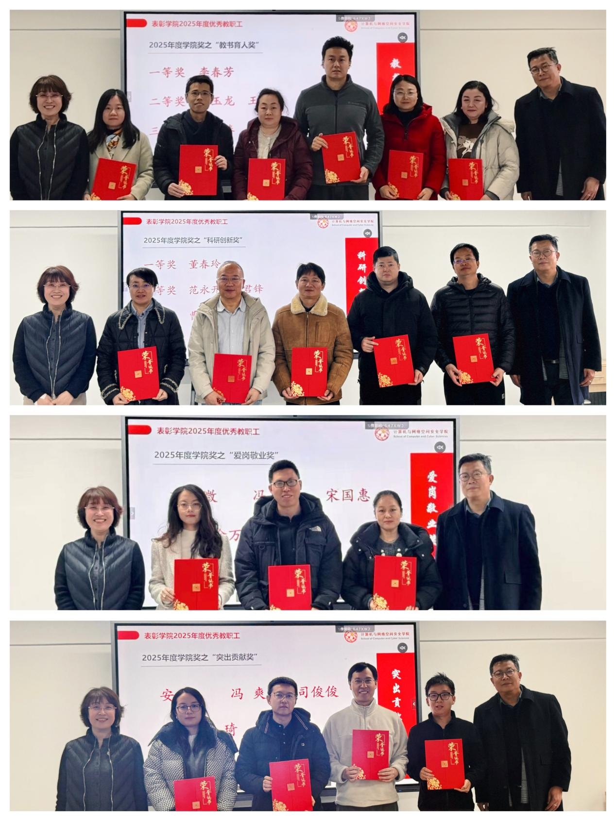 随后,大会举行了学院2025年度优秀教职工表彰仪式。学院领导为获得“教书育人奖”“科研创新奖”“爱岗敬业奖”“突出贡献奖”的教职工颁发荣誉证书,充分肯定他们在潜心教学、科研攻坚、管理服务及学院建设等岗位上展现出的专业素养与奉献精神。此次表彰既是对过往工作的总结肯定,更是对未来发展的激励动员,引导全体教职工以先进为镜、以典型为范,汲取榜样力量,砥砺育人初心,在新征程中携手同行,为学校和学院的发展注入更强劲的奋进动能。