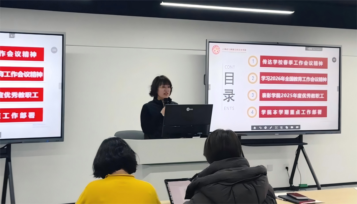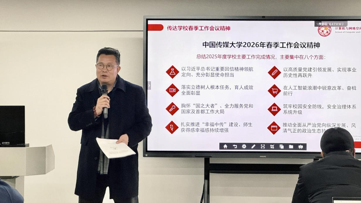 张晶晶副经理领学了2026年全国教育工作会议精神,并结合学院育人实践深入阐释了会议要义与战略部署。她表示,会议系统总结了“十四五”以来教育事业取得的历史性成就,明确了2026年作为“十五五”开局之年与教育强国建设三年行动计划承上启下的关键节点,部署了八项重点任务,即:坚持为党育人、为国育才,高质量推进思政课程与数字网络育人融合;优化高等教育结构,深化“双一流”建设与分类发展;全面推动人工智能赋能教育,加快全学段人工智能通识教育普及;强化科教融汇与拔尖创新人才培养;建强高素质专业化教师队伍,深入实施教育家精神铸魂强师行动;扩大高水平教育对外开放,提升中国教育全球影响力;同时坚决守牢政治安全、校园安全与廉洁底线。结合学院实际,张晶晶副经理强调,全体教职工要深刻把握教育发展新方位,将国家部署与传媒育人实践紧密结合,在课堂教学改革、AIGC能力培养、通识教育深化等方面主动作为,切实把会议精神转化为提升人才培养质量、服务教育强国建设的实际行动。